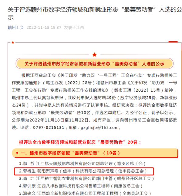 日前,根據(jù)關于評選贛州市數(shù)字經(jīng)濟領域和新就業(yè)形態(tài)“最美勞動者”人選的公示名單中,朝陽聚聲泰(信豐)科技有限公司總經(jīng)理郭橋生榮登贛州市數(shù)字經(jīng)濟領域“最美勞動者”榜單。