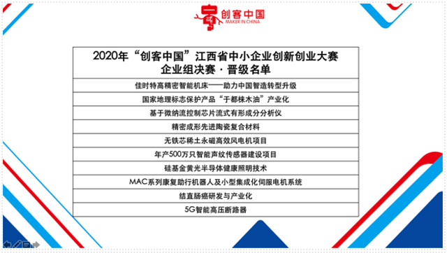 9月9日,2020年“創(chuàng)客中國”江西省中小企業(yè)創(chuàng)新創(chuàng)業(yè)大賽經(jīng)過多輪比拼,終于進(jìn)入到最精彩的決賽階段!此次總決賽與前面的復(fù)賽都在南昌高新區(qū)舉行,近千名參賽團隊由報名、初賽、復(fù)賽、決賽等各個環(huán)節(jié)組成,經(jīng)過各個環(huán)節(jié)緊張激烈的角逐,終于評出了本次大賽的獲獎團隊,朝陽聚聲泰(信豐)科技有限公司在康良軍同志的代表下,公司“年產(chǎn)500萬只智能聲紋傳感器建設(shè)項目”榮獲了本次總決賽的第三名。